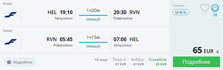 Следующий перелет на крыльях Finnair Хельсинки – Рованием с 5 по 12 февраля за €65.