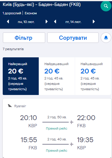 Ще приклади дат на рейси Київ – Карлсруе (Баден-Баден):