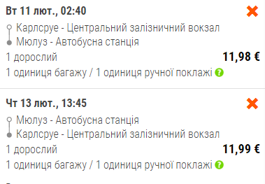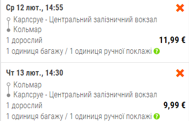 Час у дорозі з Карлсруе до невеликого містечка Ельзасу – Мюлуз, який знаходиться на кордоні зі Швейцарією, поруч зі швейцарським Базелем – 3 год. 20 хв. Вартість квитка в один бік від €12. Є вибір часу.