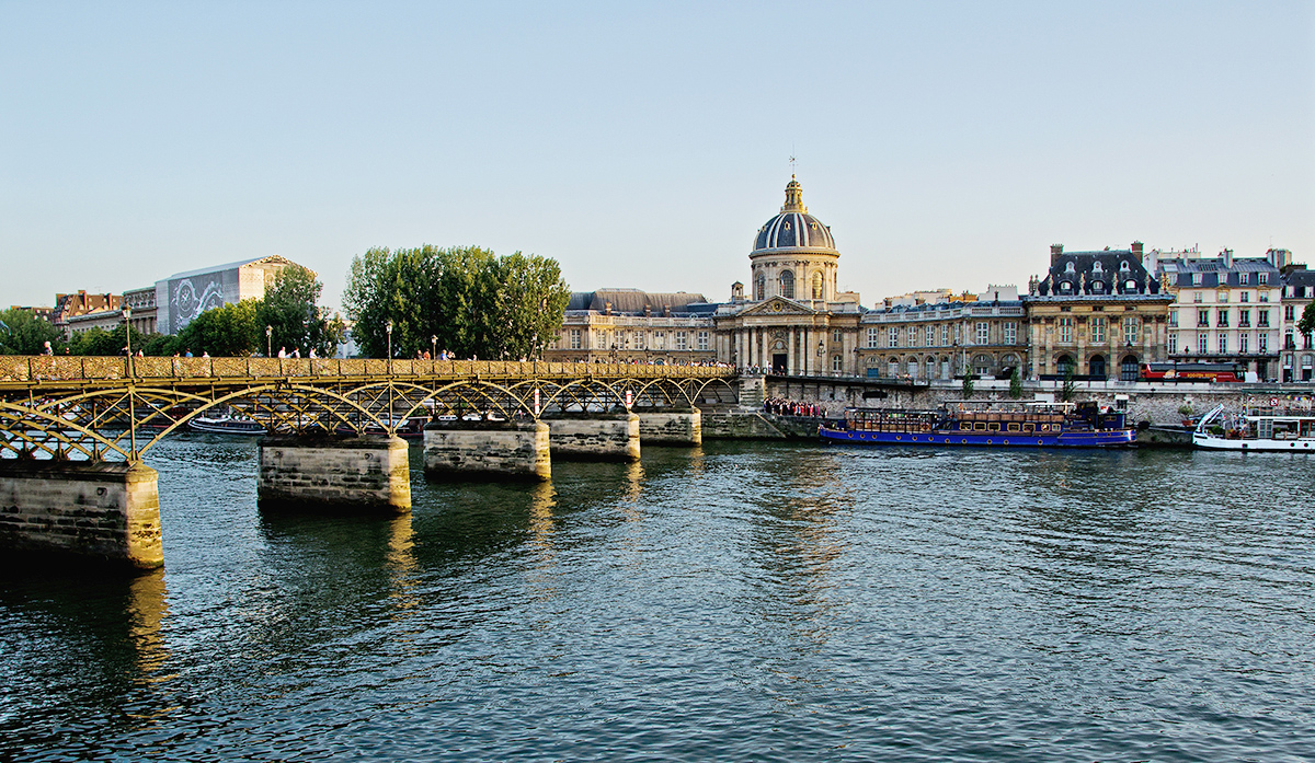 Речной трамвай подплывает к пешеходному мосту Искусств. Он ведёт к сокровищнице мировой культуры Лувру, поэтому и получил такое название. На перилах видны замочки, оставленные влюблёнными. Парижане любят устраивать на мосту пикники.