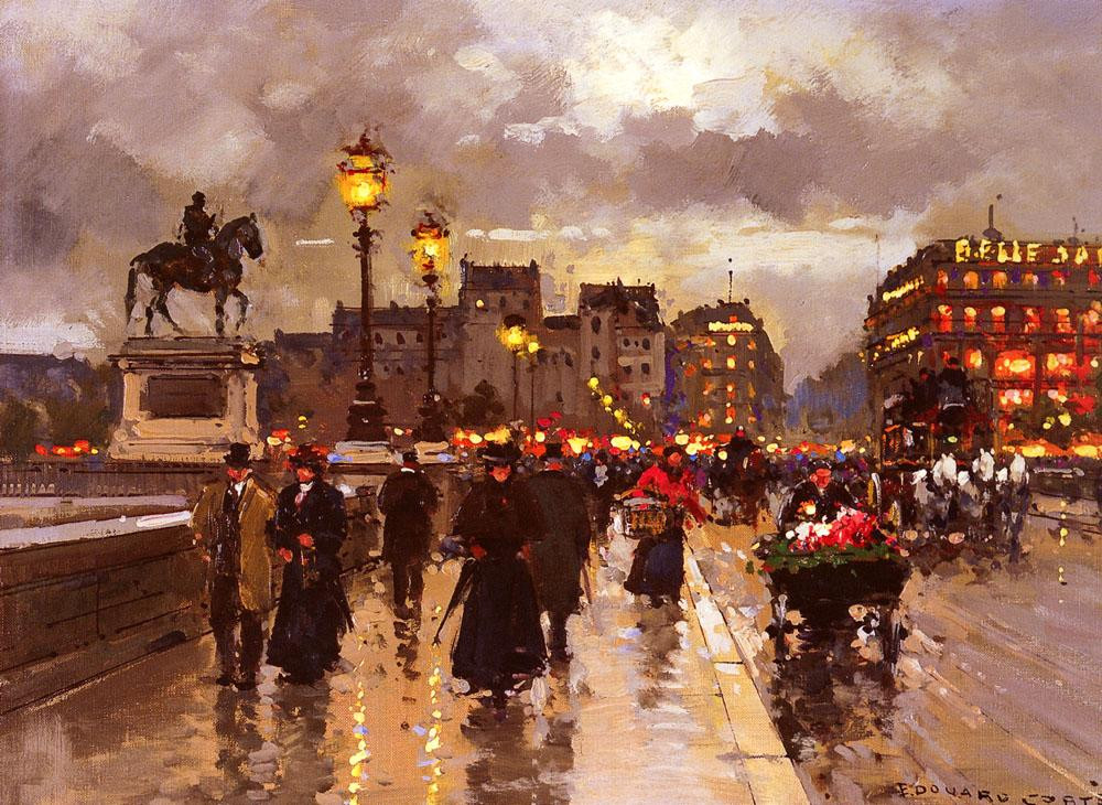 Париж постимпрессиониста Эдуарда Леона Кортеса наполнен дождями. Но веселые яркие огоньки фонарей и домов отражаются в воде тротуаров и мостовых и создают особый образ необыкновенного города. О востребованности его работ говорят цены на аукционах. А несколько из них украдены и пребывают в розыске.