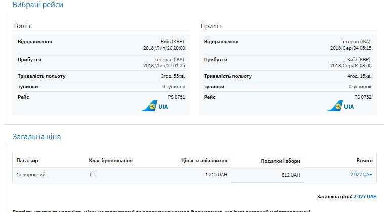 Київ – Тегеран, 26 липня – 4 серпня, 67 євро в обидва боки.