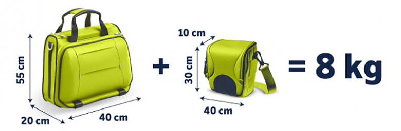 Для пассажиров, летящих эконом-сервис классом допускается только 1 единица ручной поклажи. Ее максимальный вес не должен превышать 8 кг, а параметры – 55x40x20. Электронику можно брать на борт только в составе ручной клади, провозить ее отдельно запрещается. Если же при посадке обнаруживается, что ручная кладь превышает необходимые габариты или вес, пассажиру могут отказать в праве на перелет. В случае, когда рейс не слишком загружен, и в салоне есть дополнительное место, ее могут принять с доплатой в 60 евро.