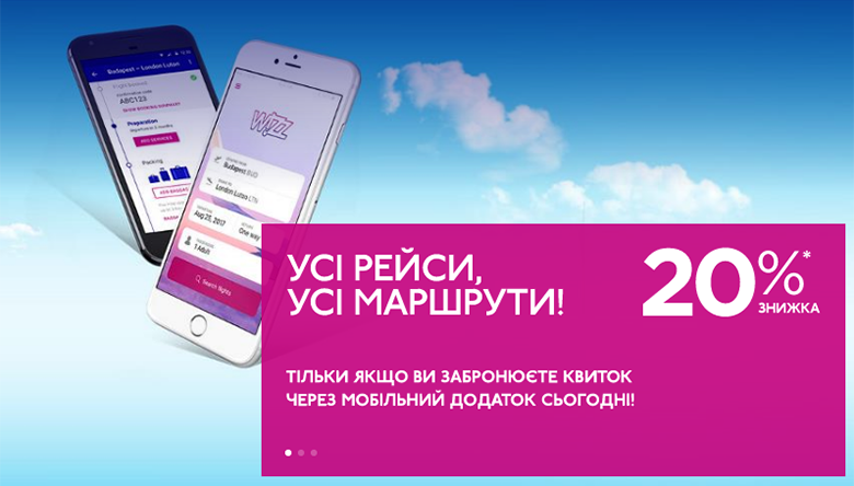 Авиакомпания Wizz Air предлагает скидку 20% на все билеты и маршруты при условии бронирования через мобильное приложение и бронирования билетов сегодня, 5 декабря 2017 г.