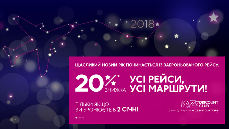 Сьогодні учасники Wizz Discount Club можуть забронювати квитки зі знижкою 20% на всі рейси та маршрути. Забронювати квитки за акційною ціною можна до кінця доби 2 січня.