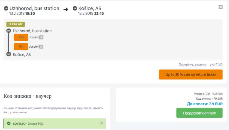Ужгород – Кошице, 13 лютого – 7,9 євро за двох