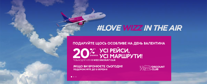 Авіакомпанія Wizz Air пропонує зробити особливий подарунок своїй другій половинці до Дня Святого Валентина, і дарує знижку 20% учасникам Wizz Discount Club на всі рейси та маршрути. Забронювати квитки за акційними цінами можна сьогодні, 8 лютого.