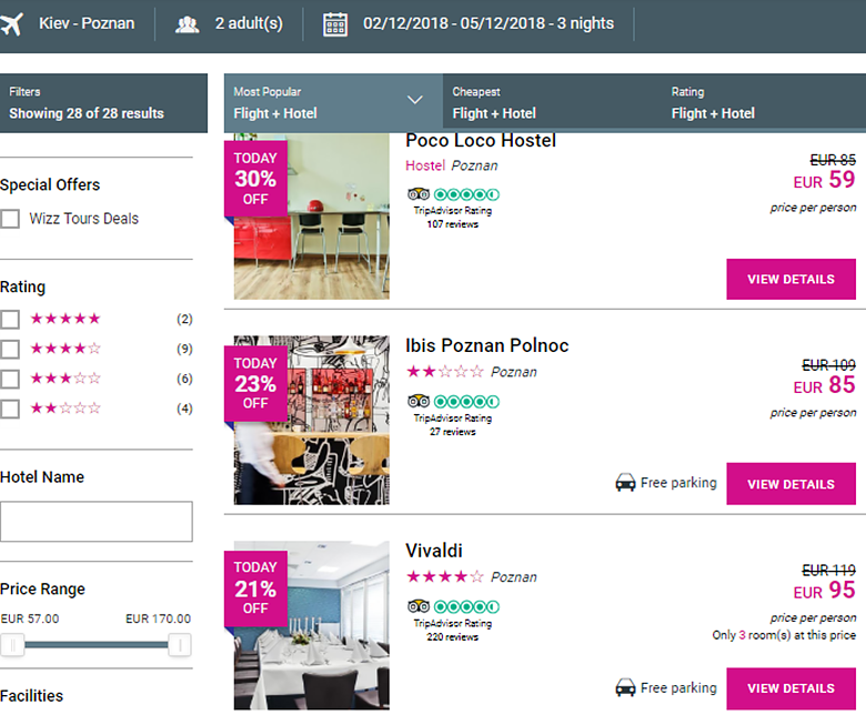 В якості прикладу пропонуємо подорож з Києва до Познані на дати 2-5 грудня. Вартість перельоту та проживання в готелі стартує з €59 з особи.