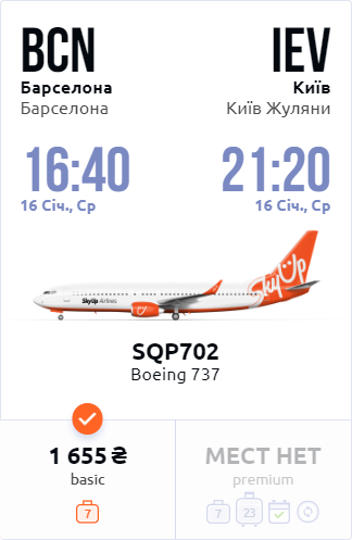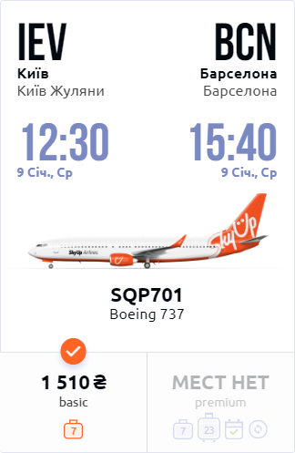 | Київ – Барселона | 29.12.18 | ср, сб | 12:30 | 15:40 | від ₴1508 |