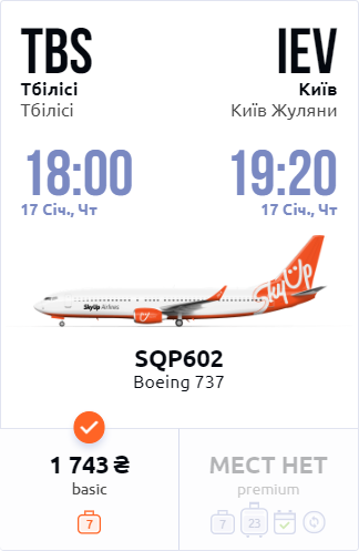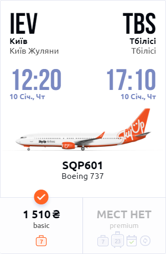 | Київ – Тбілісі | 23.12.18 | чт, нд | 12:20 | 17:10 | від ₴1508 |