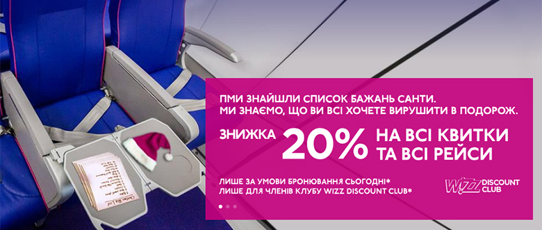 Тільки сьогодні Wizz Air пропонує 20% знижки на всі квитки для членів Wizz Discount Club. Ось декілька зразків бронювання: