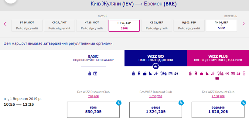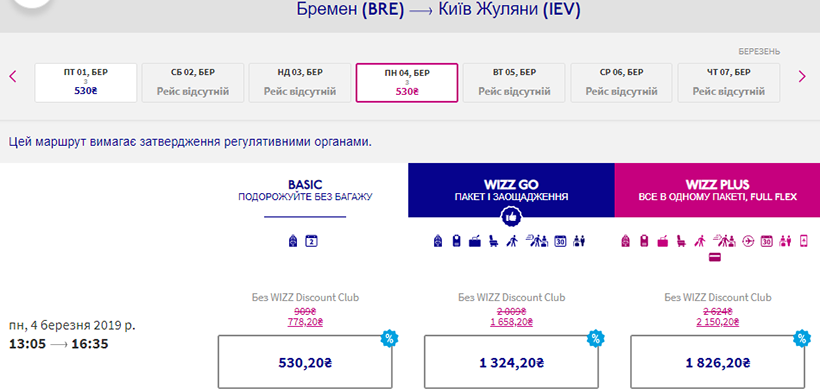 Подорож плануємо на період 1-4 березня. Ціна туда-назад зі знижкою – €33 або ₴1060 для учасників Wizz-клубу та €48 або ₴1556 для всіх інших.