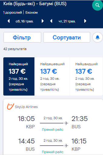 Приклади перельотів Київ -Батумі та назад на деякі дати: