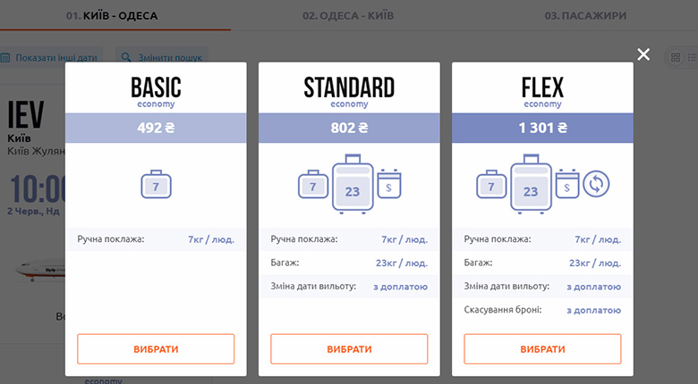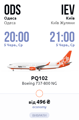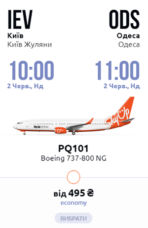 ДетальнішеНа внутрішні рейси можна придбати квитки за ціною від ₴492 в один бік. В якості прикладу пропонуємо переліт Київ – Одеса на дати 2-5 червня.
