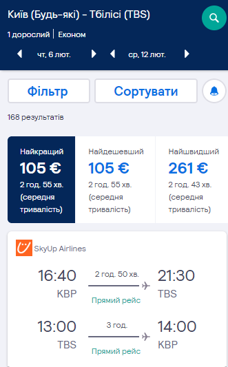 Київ — Тбілісі, 6-12 лютого — €105