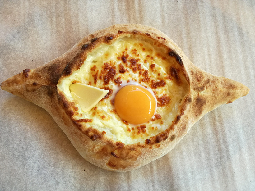 Хачапури – это гордость Грузии, и в каждом регионе свои секреты приготовления. Бывают хачапури по-имеретински, по-мегрельски, по-аджарски. Любопытно, что в большинстве случаев они готовятся из теста без дрожжей. В названиях кроется подсказка – именно в Аджарии стоит побаловать себя хачапури по-аджарски. Пирог в форме лодки наполнен сыром, сырым яйцом и кусками тающего масла. Его подают насколько горячим, что вы не сразу решаетесь взяться за «рога» и окунуть их в ароматное озеро посередине. Мы попросили «средний» хачапури. Он оказался таким большим, что пришлось его делить на несколько человек.