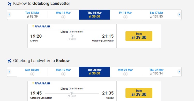 Краків – Гетеборг, 15-20 березня – 19 євро у обидва боки.