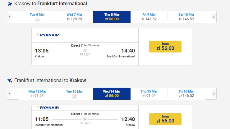 Краків – Франкфурт-на-Майні 8-14 березня – 27 євро у два боки.