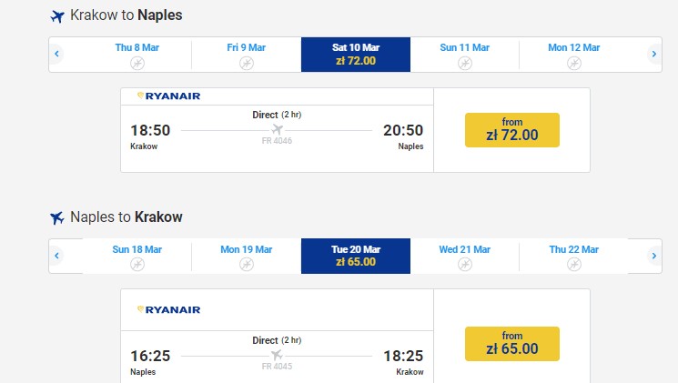 Краків – Неаполь, 10-20 березня – 33 євро у два боки.