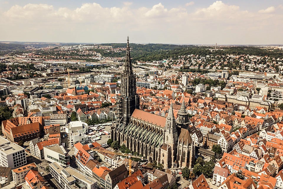 Aerial view of Ulm Minster at day time - Нотр-Дам-де-ла-Пе – 158 м (столиця Кот-д’Івуара – Ямусукро). Висота включає хрест на головному куполі. Найвища церква за межами Європи. Побудована нещодавно – в 1989 році. Будувалася по зразку собору Святого Петра у Римі.