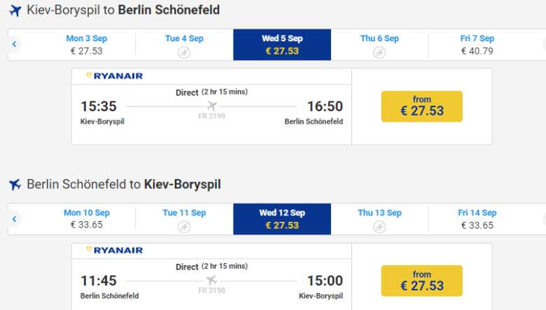 Ryanair має намір почати польоти з Києва до Берліна 3 вересня з частотою 4 рази на тиждень: по понеділках, середах, п’ятницях і неділях. Мінімальна ціна квитків стартує від € 27,5 в одну сторону.