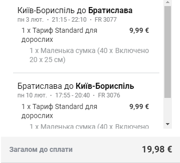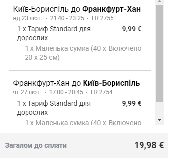 Київ — Франкфурт (Хан), 23-27 лютого — €20 у два боки.