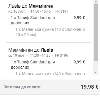 Львів — Меммінген, 16-19 лютого — €20 у два боки.