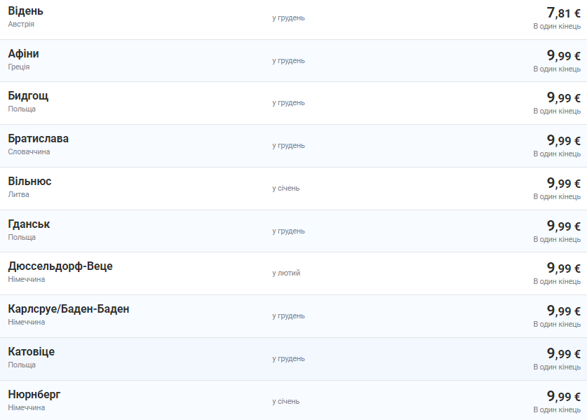 Приклади цін в один бік з Києва (аер. Бориспіль):