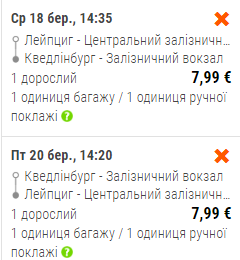 Рейсами автобусного перевізника FlixBus можна доїхати з Лейпцига до Кведлінбургу. Рейси щодня. Дати подорожі можна корегувати самостійно.