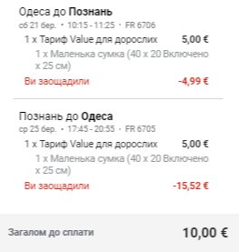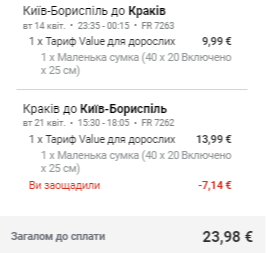 У вартість квитів входить ручна поклажа розмірами до 40х20х25 см.