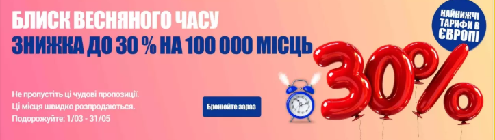 Авіакомпанія Ryanair оголосила швидкий розпродаж 100 тис. квитків зі знижкою до 30%.