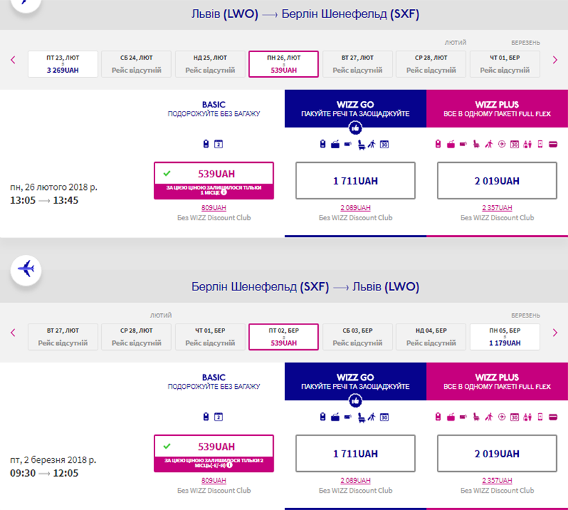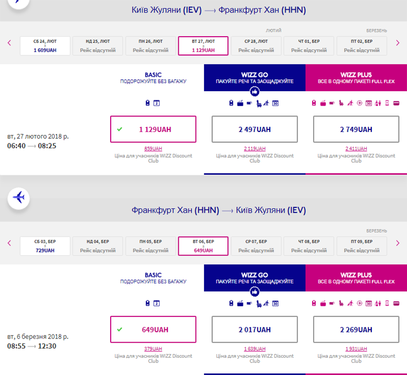 Даты – 26 февраля – 2 марта. Стоимость билетов туда-обратно для участников Wizz-клуба составит 1078 грн або €34. Все остальные заплатят за билет в две стороны – 1618 грн или €51.