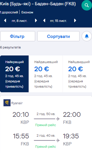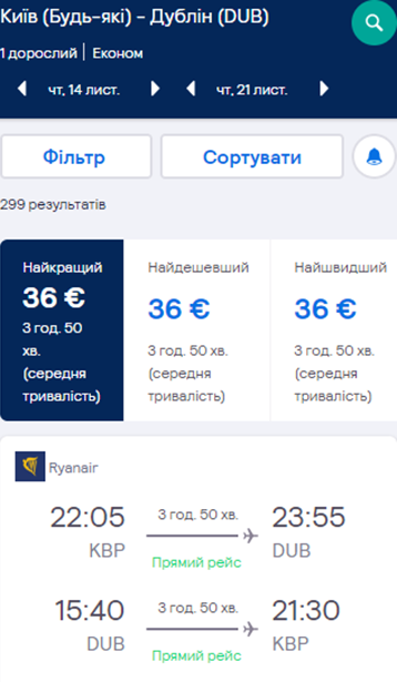 Дати – 14-21 листопада. Вартість квитків в обидва боки – €36.