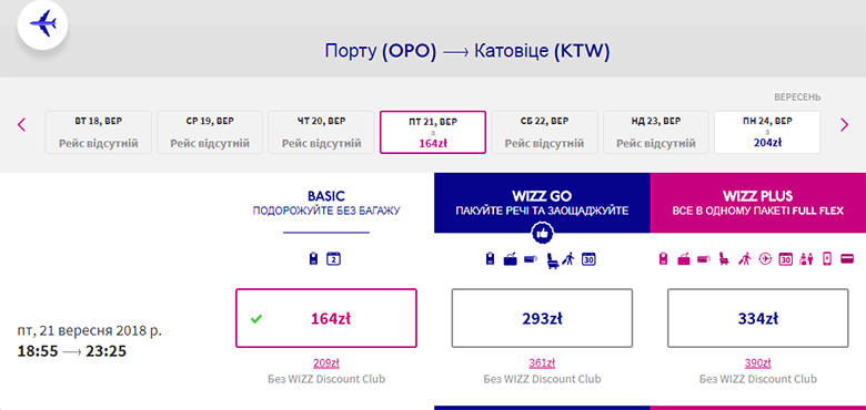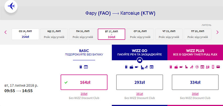 В качестве примеров предлагаем перелет из Катовице в Фару и обратно. Участники Wizz-клуба заплатят за билеты в обе стороны €107, а все остальные – €130. Даты путешествия – 10-17 июля.