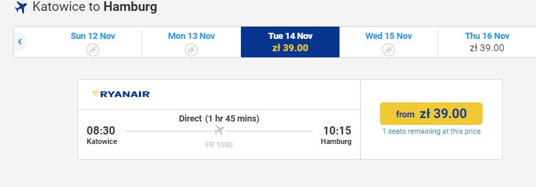 Наступний крок – переліт Катовіце-Гамбург 14-23 листопада – €23 в обидва боки.