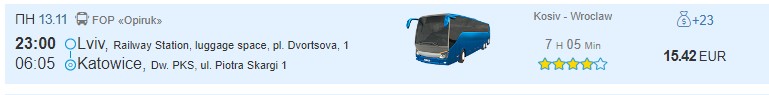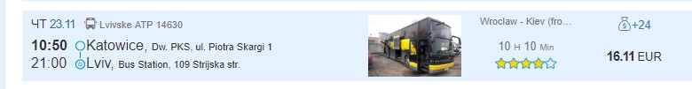 Катовіце-Львів 23 листопада – €16 обидва боки.