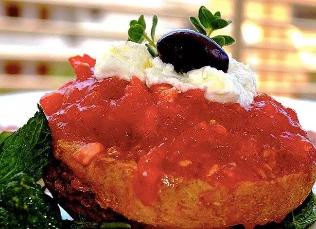 Дакос: Ця проста, але неймовірно смачна страва готується з сухого ячмінного хліба, який розмочують у воді або вині, а потім поливають оливковою олією, томатами, сиром фета та орегано. Дакос – це чудовий варіант для легкого обіду або перекусу.