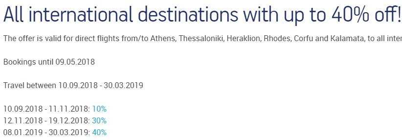 Авіакомпанія Аegean оголосила акцію: до 40% знижки на всі рейси в/з Греції при умові бронювання до 09.05.2018 р. на період подорожі з 10.09.2018 по 19.12.2018 та з 08.01.2019 по 30.03.2019.
