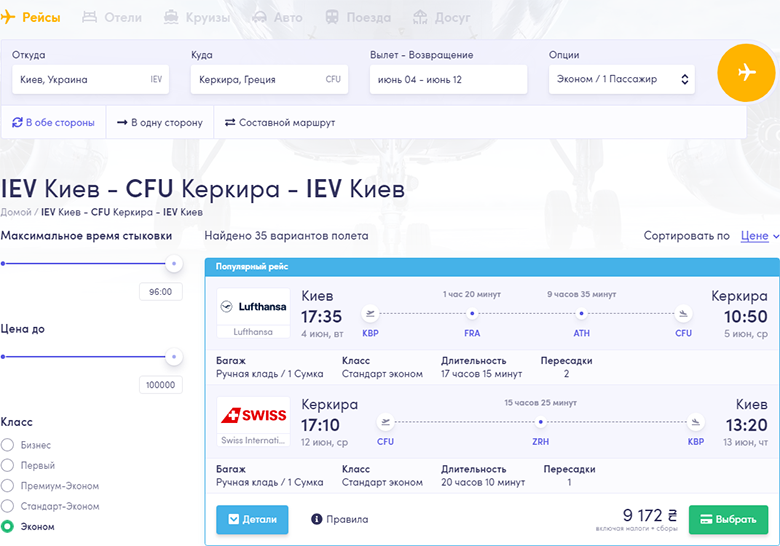 На довольно нестандартный запрос перелета до о. Корфу Travellizy предложил несколько вариантов: