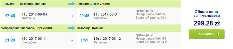 Катовіце – Лісабон – 4-11 червня за €72 в обидва боки.