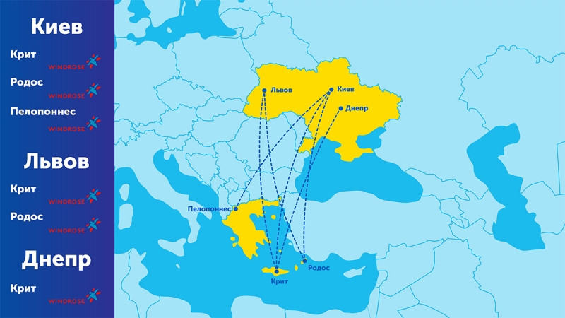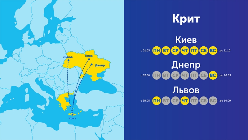 Чартерная программа на Крит из Киева стартует 1 мая с вылетами каждые 10/11 ночей, а с начала июня до 11 октября вылеты будут ежедневными. Из Днепра самолеты будут летать каждое воскресенье раз в неделю. Из Львова — два раза в неделю: понедельник и четверг.