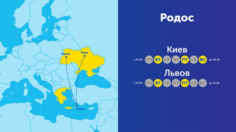 Программа на Родос из Киева начинается 1 мая по пятницам раз в неделю, а с конца мая самолеты будут летать по вторникам, пятницам и воскресеньям до 4 октября трижды в неделю. Из Львова — с 29 мая до 11 сентября каждые 10//11 ночей во вторник или пятницу.