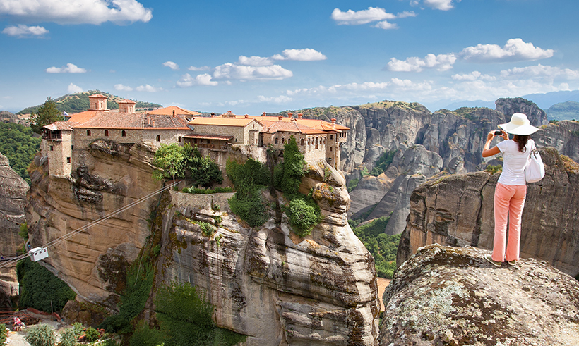 Достопримечательностью Греции является уникальное место Метеора, располагается оно в северной части Греции, около города Каламбака. Тут на каменных столпах высотой от 300 до 600 м отшельники построили монастыри, которые действуют до этого времени – два женских и четыре мужских. Подняться к храмам можно по ступенькам.