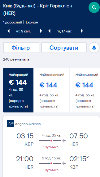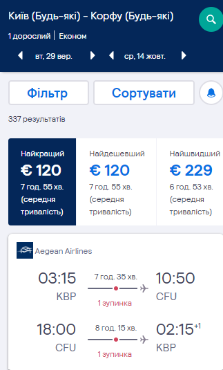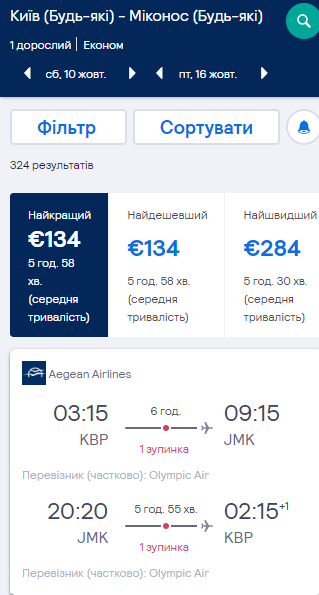 Дати: 29 вересня-14 жовтня. Ціна квитків у дві сторони — €120. По дорозі пересадки в Афінах.