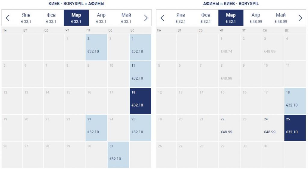 Пример: Киев – Афины, 18-25 марта – €64 в две стороны.