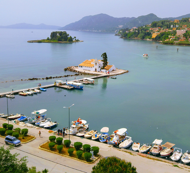 - півострів Каноні (Kanoni), де знаходиться крихітний мальовничий острівець (Mouse Island) лише з однією спорудою – жіночим монастирем 17-го століття (Vlacherna Monastery),