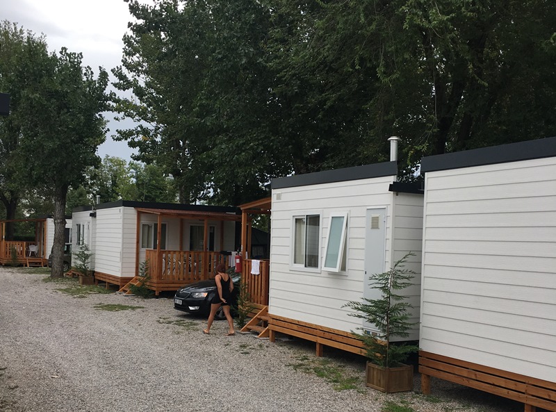 Паркинг и жилье в Венеции стоит негуманных денег. Чтобы уменьшить расходы, рекомендуют бронировать жилье на материковой части, в Местре. Неожиданно для себя бронируем кемпинг, подкупает парковка на территории, цена и отличные отзывы. Кемпинг «Венеция» – это огражденная территория, где останавливаются путешественники на караванах или с палатками, но можно жить с удобствами в отдельном домике. Мы выбираем домик. На минимальной площади эргономично разместились две комнатки – каюты, общая зона со столом и холодильником и открытая веранда. В санузле добротная новая сантехника, душевая кабинка, все идеально работающее. Удобные кровати, белоснежное постельное белье. Правда, в комплект не входят полотенца, их можно получить за отдельную плату, как и пульт от кондиционера. Рядом с домиком место для авто. На въезде – ресепшен, где нам дают карту кемпинга, помечают крестиком наш домик, выдают ключи и рассказывают, что где что находится. Там же покупаем билеты на автобус в Венецию (€ 1,5). Кемпинг бронировали через Букинг.