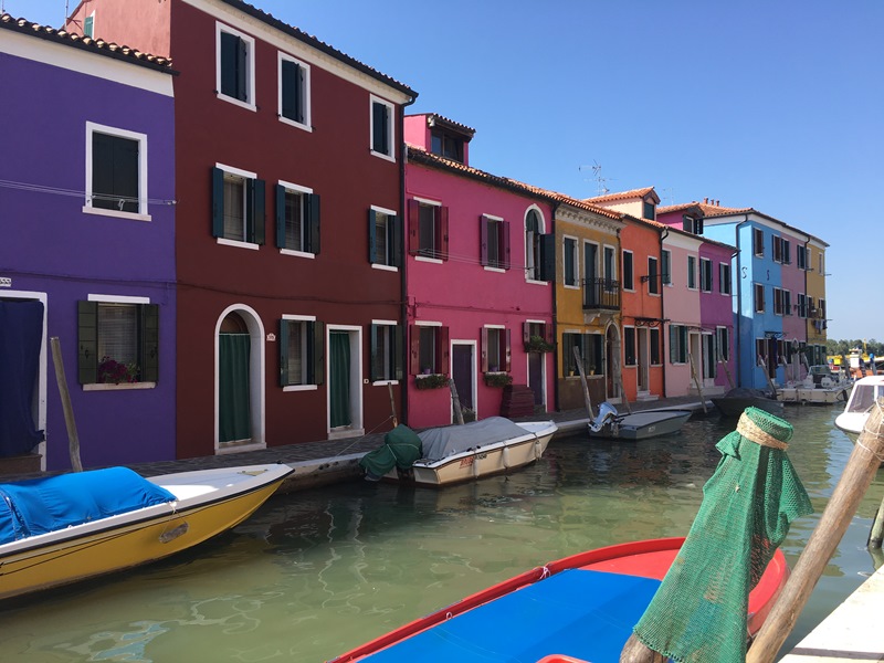 Съездить на острова Бурано и Мурано – еще одна мечта, которую удалось реализовать в эту поездку. Венецианский водный общественный транспорт – вапоретто №12 везет на остров Бурано от причала F.te Nove. Покупаем билеты на целый день (€ 20 с человека) – и вперед. По легенде, моряки красили дома в яркие цвета, чтобы легко узнать свой в утренних сумерках. Сейчас Бурано – туристический аттракцион. Сюда приезжают за порцией цветотерапии. Яркие краски вокруг и правда излучают радость и энергию.