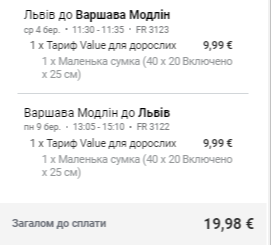 У вартість квитків входить ручна поклажа розмірами до 40х20х25 см.