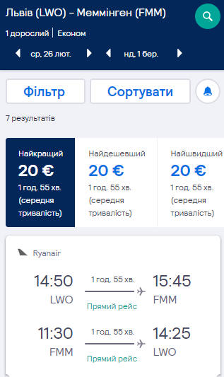 Львів — Меммінген. Дати: 26 лютого-1 березня. Ціна у два боки — €20